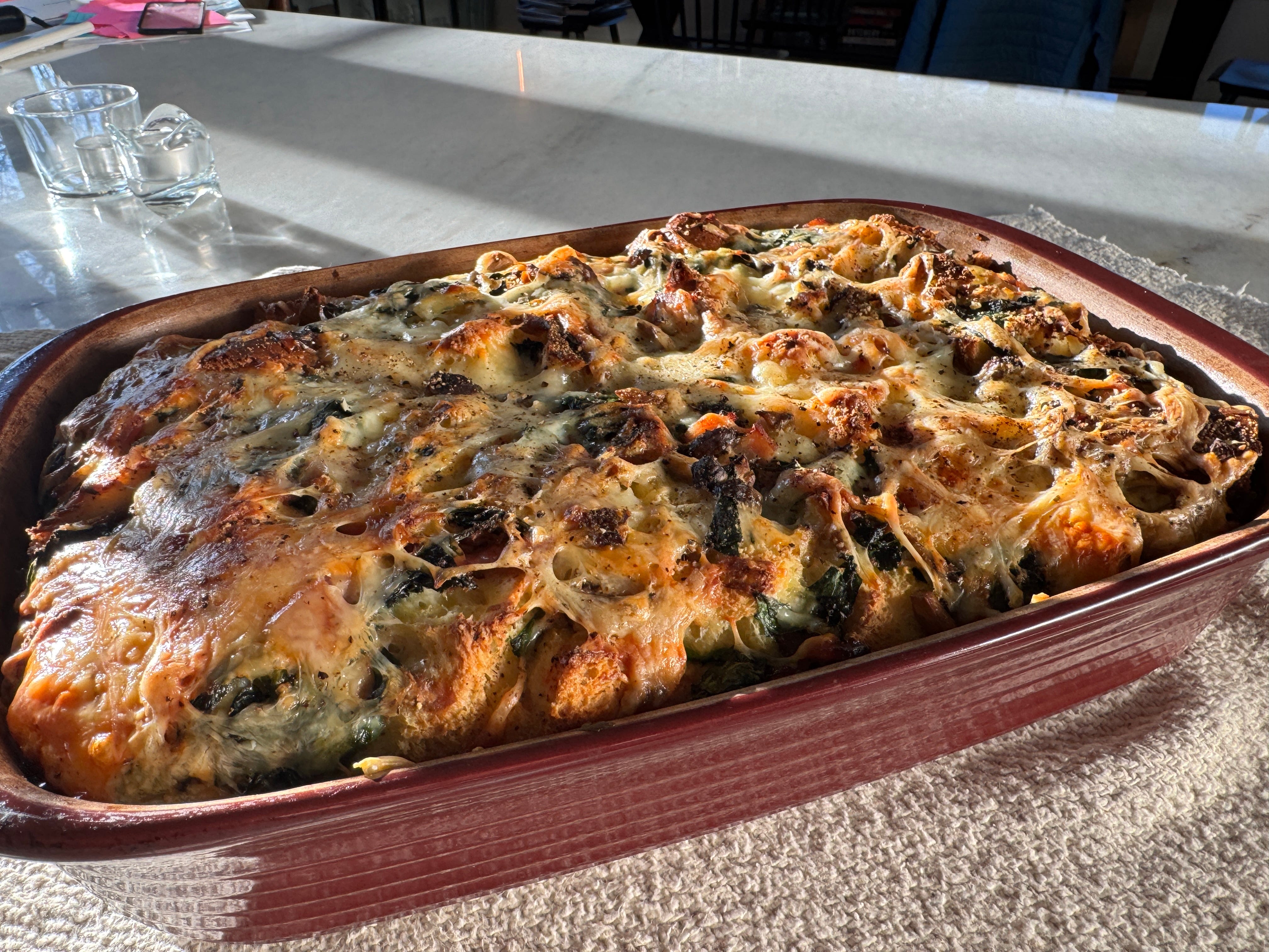 This bake is built for exactly that kind of morning. The base stays consistent — bread, eggs, milk, cheese — but what goes into it can shift with the season, what you have on hand, or what caught your eye at the market. A different vegetable, a new cheese, a handful of fresh herbs. The variations are as flexible as the morning itself, and a few favorites are listed after the recipe.