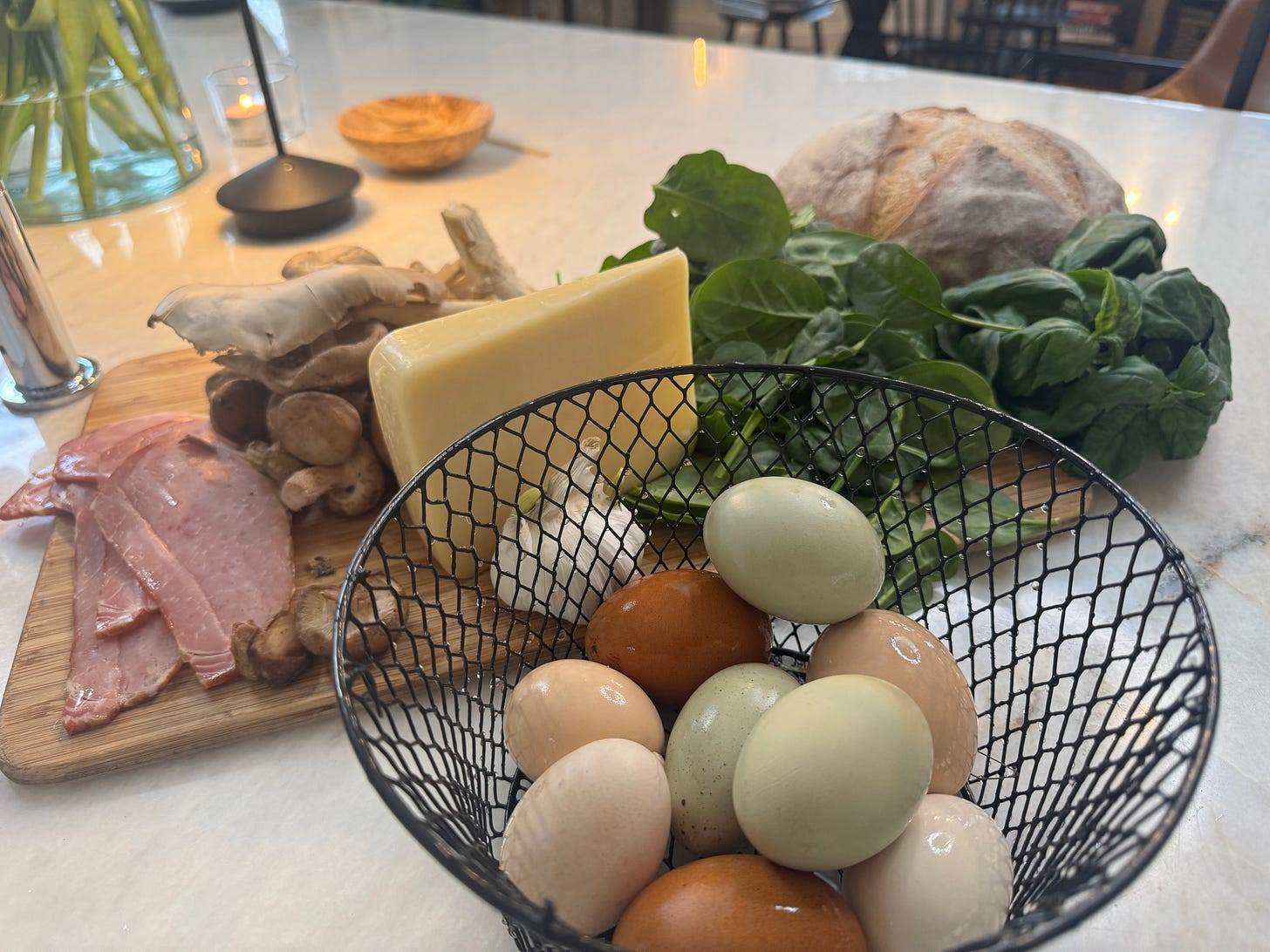 This version leans into depth and balance: heirloom mushrooms, wilted spinach, Canadian bacon, and Gruyère. Rich, but grounded. The kind of dish that carries a full table without asking much of you in the moment.