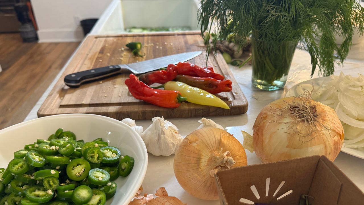 Prep the Vegetables: Wash cucumbers, garlic scapes, banana peppers, jalapeños, and Chinese five spice peppers thoroughly. Slice cucumbers into 1/4-inch rounds or spears. Cut garlic scapes into 4-inch lengths. Slice peppers into 1/4-inch rings. If using onion, slice thinly.